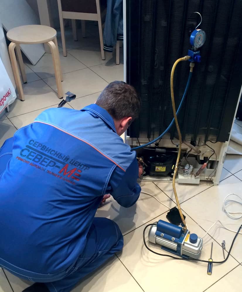 Мастер подключает манометр, чтобы заправить холодильник фреоном.