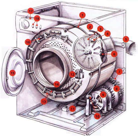 Обычно в простых машинах барабан вращается в одну сторону. Машина, в которой барабан меняет направление вращения через определенные промежутки времени, сушит более эффективно и меньше спутывает вещи.